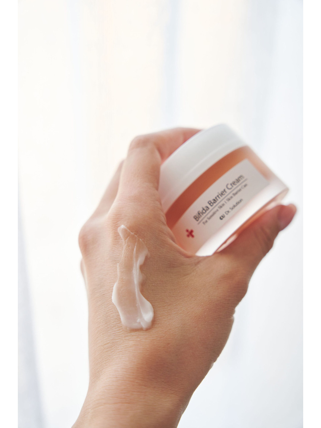 Омолоджуючий крем з пробіотиками CUSKIN CU Dr.Solution Bifida Barrier Cream доглядає за зрілою шкірою з наявністю перших або глибоких вікових змін. Крем усуває зморшки, здійснює комплексний догляд за шкірою, яка втратила пружність, імунітет і здоровий тон. Він зволожує її, живить і пом'якшує, моментально знімає стягнутість, усуває сухість і лущення. Крем зміцнює шкіру, підвищує її захисні функції, загоює пошкодження. До складу крему входить комплекс пробіотиків 65%, який зволожує, утримує вологу в шкірі, відновлює її бар'єрні функції, покращує стан мікробіома і зміцнює шкірний імунітет. Він покращує мікроциркуляцію, активізує доставку поживних речовин, заспокоює і загоює шкіру. Масло макадамії в складі багато корисними для шкіри кислотами, вітамінами Е і С і іншими цінними речовинами. Воно запускає процеси регенерації, ефективно загоює пошкоджену шкіру, допомагає відновити колаген і еластин. Масло усуває лущення, пом'якшує огрубілу шкіру, благотворно діє на шкіру після агресивних косметичних процедур. Церамід NP в складі позбавляє шкіру від сухості, піклується про захисний бар'єр. Підтримує правильний рівень зволоженості в шкірі.