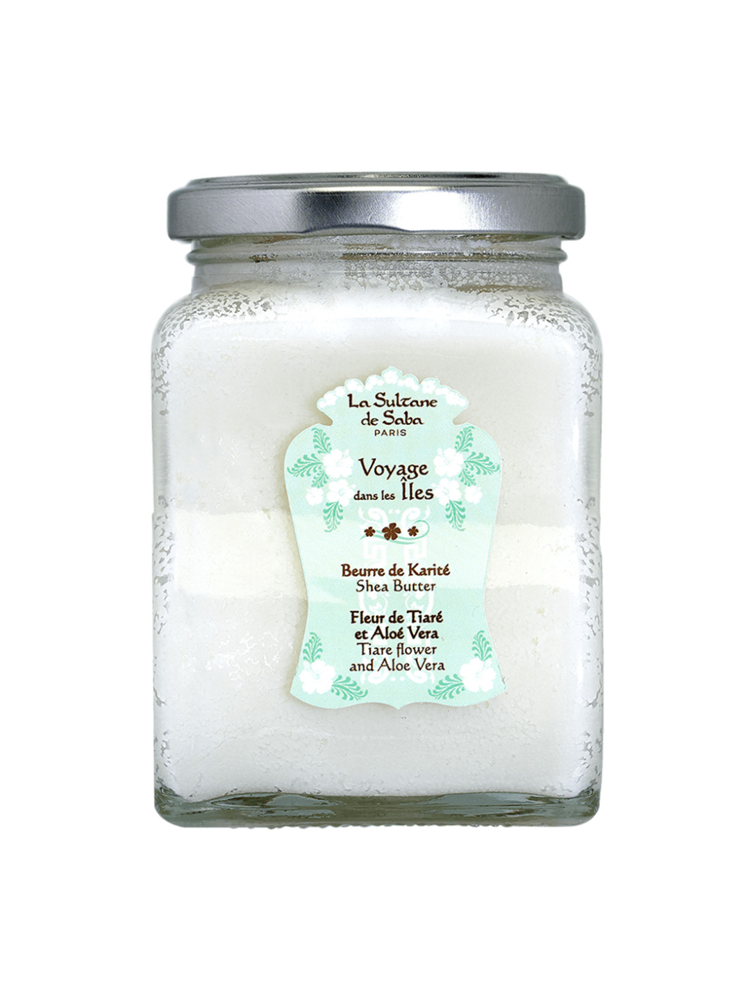 Олія Каріте Тіарі та Алое Вера La Sultane De Saba Tahitian Shea Butter Tiare Flower And Aloe Vera - це натуральна олія каріте з освіжаючим ароматом квітів та алое. Вона інтенсивно живить шкіру тіла, обличчя і волосся, насичує їх вітамінами і мінералами, зволожує, відновлює структуру тканин і бореться з розтяжками. Нанесене на сухе волосся масло каріте захищає волосся від зовнішніх впливів і насичує його корисними вітамінами та мінералами. Продукт потужно бореться з сухістю шкіри, усуває подразнення і сприяє запобіганню зморшок.