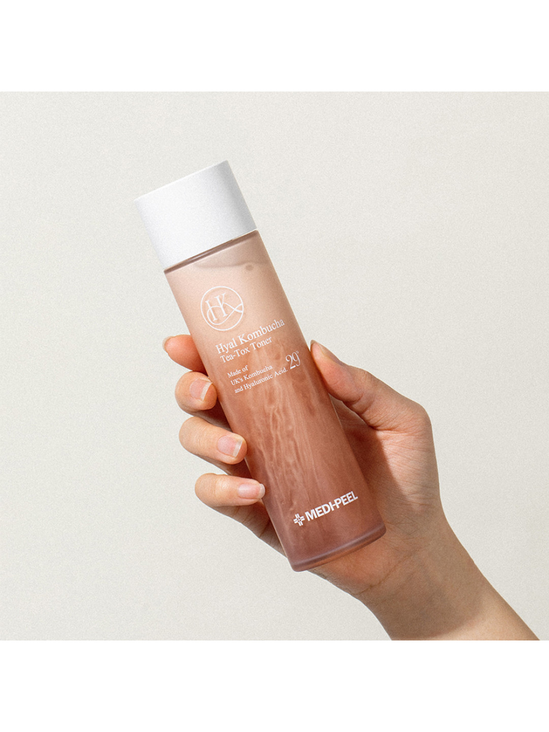 Тонер з комбучею та гіалуроновою кислотою Medi-Peel Hyal Kombucha Tea-Tox Toner інтенсивно зволожує шкіру, підвищує еластичність та пружність шкіри, сприяє ефективному оздоровленню шкіри: бореться із сухістю, почуттям стягнутості, особливо після вмивання, зменшує чутливість та знімає. та нормалізує вироблення себуму. Двофазний засіб у пропорції 7:3 складається з есенції з комбучі та гіалуронової емульсії молочної консистенції, які при змішуванні утворюють ніжну шовковисту текстуру. Комбуча, що становить 70% тонера, виготовлена всесвітньо відомою англійською компанією Ahmad Tea з високоякісного чорного чаю, що пройшов ферментацію при температурі 29° протягом 336 годин. Емульсія, що становить 30%, містить 8 видів гіалуронової кислоти та liposome з 5 видами церамідів. Тонер є функціональним засобом проти зморшок та освітлення тону, а також 100% веган засобом. Екологічна упаковка створена з органічних перероблених матеріалів із нанесенням соєвого чорнила.