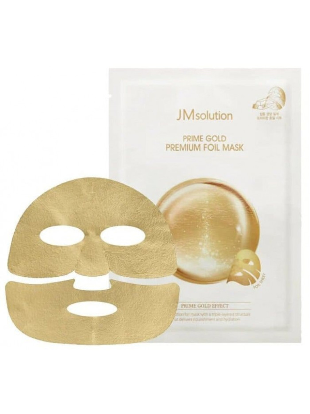 JMsolution Prime Gold Premium Foil Mask – маска, яка швидко усуне сліди втоми, відновить водний баланс та омолодить шкіру обличчя. Вона має тришарову будову, що забезпечує утримання косметичної есенції в її конструкції та блокування випаровування вологи. Таким чином компоненти проникають максимально глибоко та ефективно засвоюються. Колоїдне золото – основа формули маски. Завдяки йому шкіра оновлюється та підтягується. З його допомогою зморшки стають менш видимими, а овал обличчя стає чіткішим. Гіалуронова кислота – компонент, що відповідає за зволоження. Вона проникає у найвіддаленіші ділянки шкіри, фіксується в клітинах і блокує випаровування рідини. Також вона сприяє усуненню мімічних зморшок і робить шкірну поверхню м'якшою. Екстракт зеленого чаю попереджає появу шкірних висипань, усуває запальні процеси та загоює мікротравми. Ферменти соєвих бобів та молока, у синергії з екстрактом житнього борошна, працюють над заспокоєнням епідермісу, усувають запалення та збагачують вітамінами.
