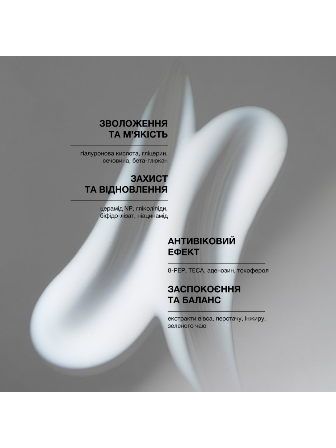 - Triple Hyaluronic Acid – три типи гіалуронової кислоти, кожен з яких має різні молекулярні розміри – від поверхневого зволоження до глибоких шарів шкіри.